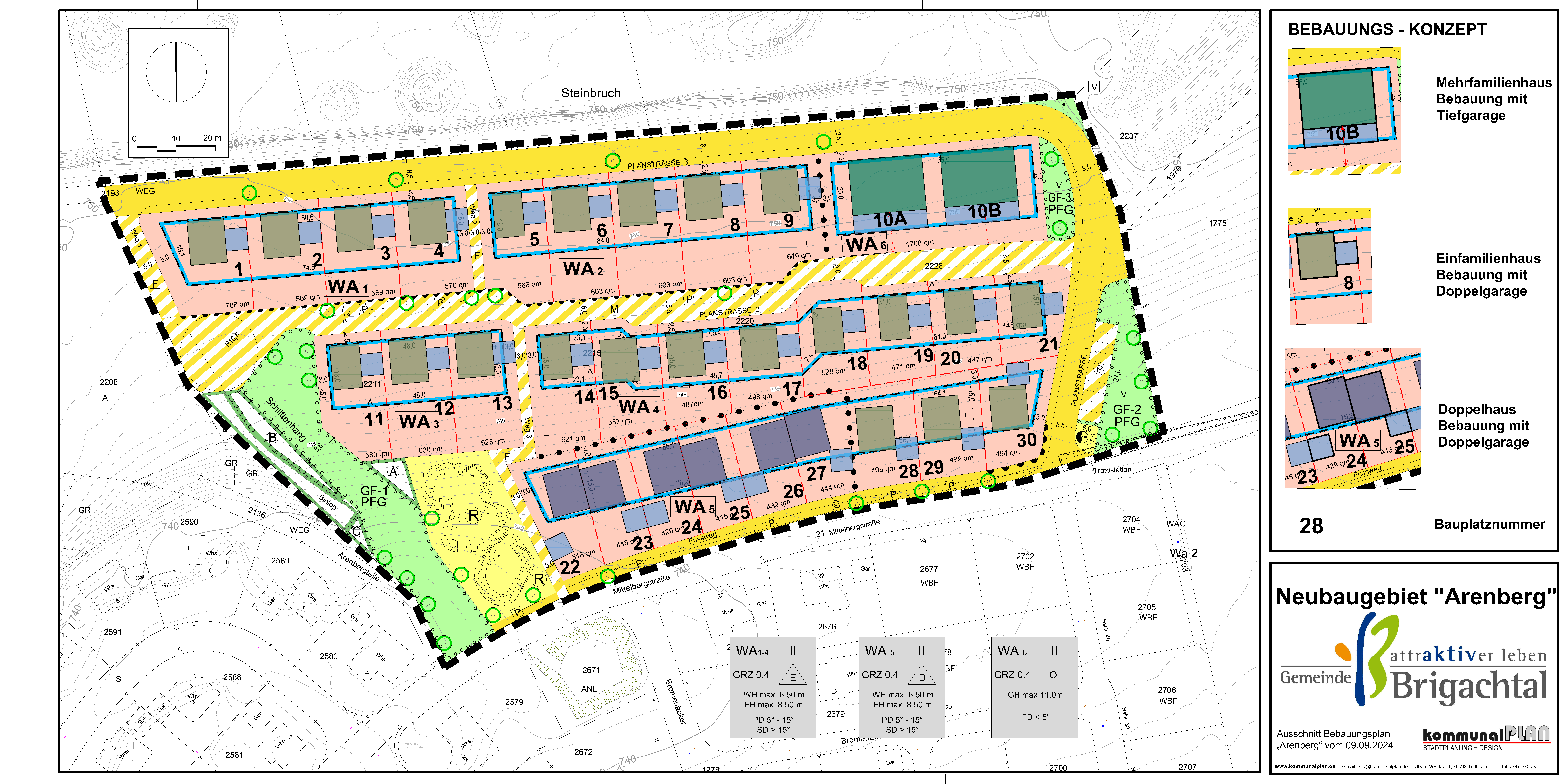 Insgesamt stehen im Baugebiet Arenberg 30 Bauplätze zur Verfügung, die in drei hangparallele Häuserreihen angeordnet sind. Für eine Einzelhaus- bzw. Doppelhausbebauung stehen 23 Bauplätze für Einzelhäuser bzw. 6 Bauplätze für Doppelhaushälften zur Verfügung. Ein Baugrundstück ist für eine verdichtete Wohnbebauung vorgesehen und bietet die planungsrechtliche Grundlage für die Errichtung eines oder zweier Mehrfamilienhäuser.