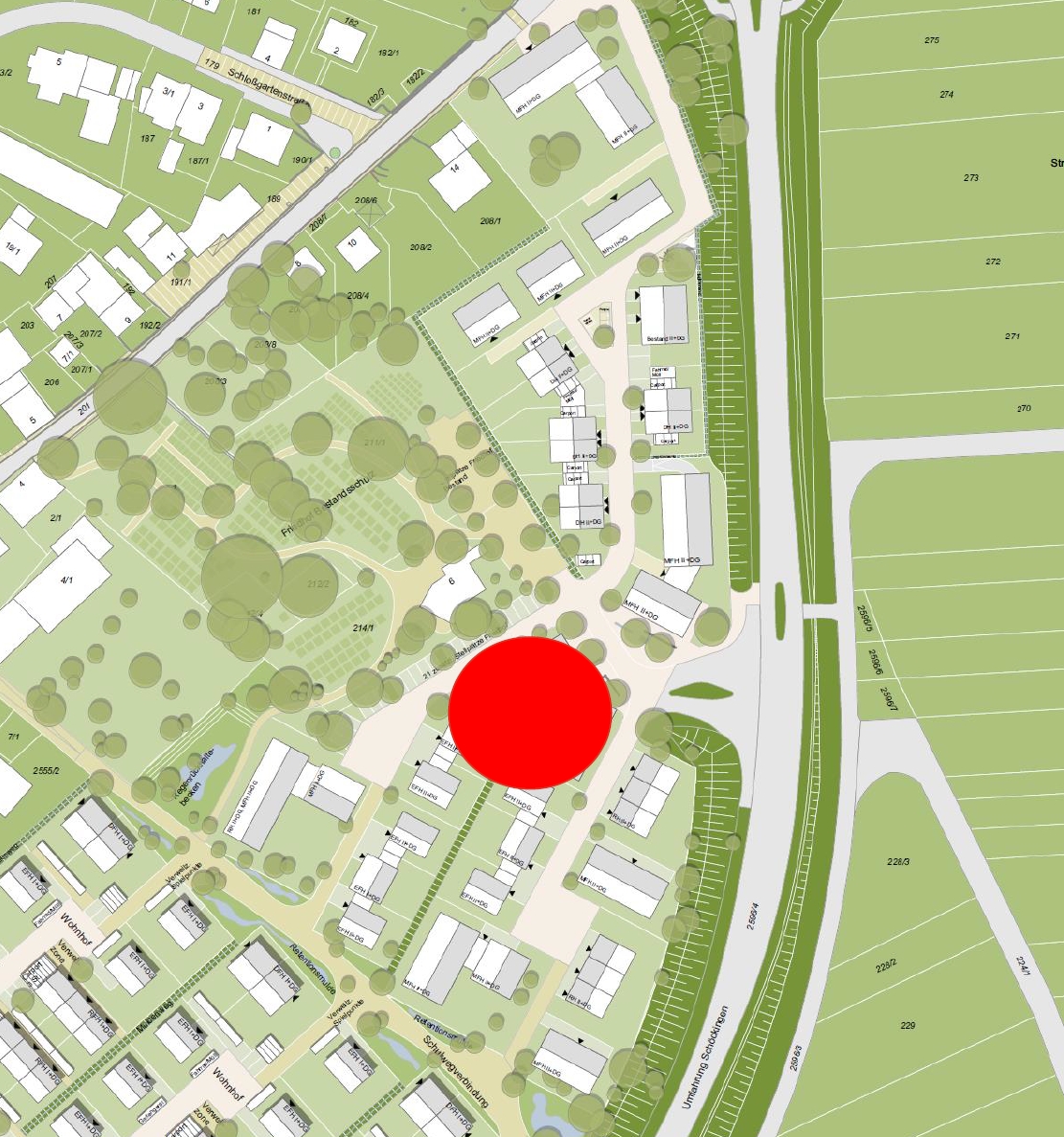 Das Neubaugebiet "Schöckingen Südost - Teil 1" befindet sich aktuell in der Entwicklung. Der dazugehörige Bebauungsplan ist derzeit in Aufstellung und beinhaltet ein Grundstück mit einer Fläche von ca. 1.720 m² auf welchem das Vorhaben realisiert werden soll. Das Grundstück liegt im Zentrum des Neubaugebietes und ist über eine Haupterschließungsstraße an den Verkehr angebunden. Im Westen und im Süden grenzen Wohngebäude an das Grundstück an. Östlich sowie nördlich schließt sich das Friedhofsgelände mit Einsegnungshalle an.
