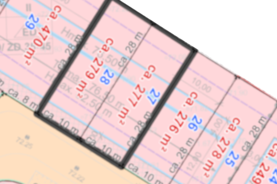 Es handelt sich um zwei nebeneinanderliegende, separat vermessene Grundstücke, die gemeinsam als eine Einheit verkauft werden. Beide Grundstücke müssen mit jeweils einer Doppelhaushälfte bebaut werden.
