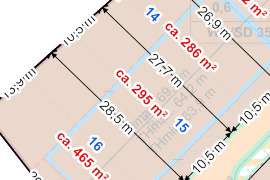 Hinzu kommen Vermessungskosten in Höhe von voraussichtlich ca. 6,00 €/m², die im Kaufpreis nicht enthalten sind und separat zum Kaufpreis in Rechnung gestellt werden.