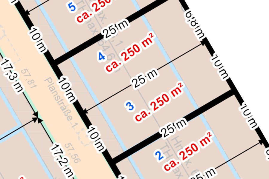 Es handelt sich um zwei nebeneinanderliegende, separat vermessene Grundstücke, die gemeinsam als eine Einheit verkauft werden. Beide Grundstücke müssen mit jeweils einer Doppelhaushälfte bebaut werden.