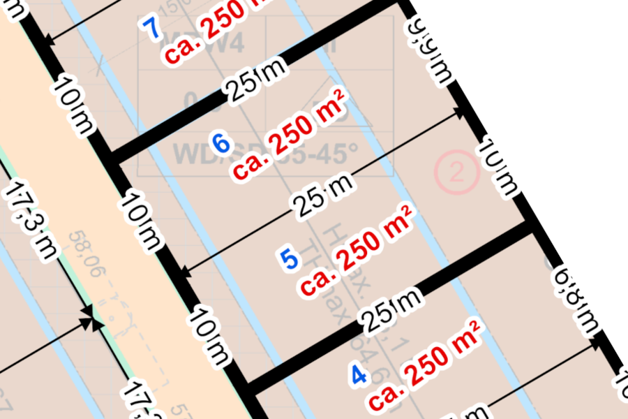 Es handelt sich um zwei nebeneinanderliegende, separat vermessene Grundstücke, die gemeinsam als eine Einheit verkauft werden. Beide Grundstücke müssen mit jeweils einer Doppelhaushälfte bebaut werden.