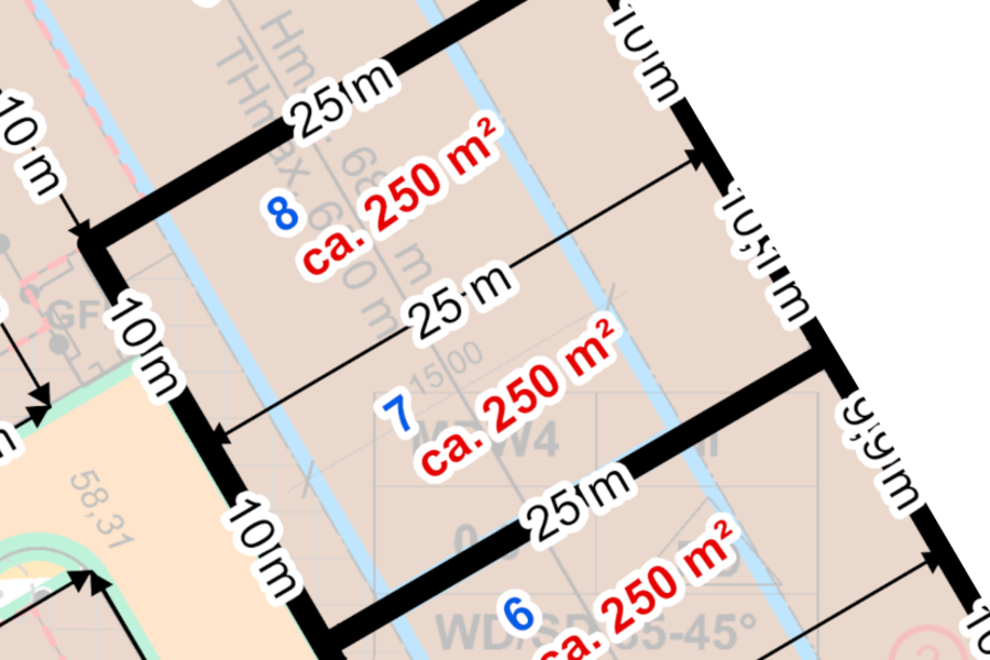 Es handelt sich um zwei nebeneinanderliegende, separat vermessene Grundstücke, die gemeinsam als eine Einheit verkauft werden. Beide Grundstücke müssen mit jeweils einer Doppelhaushälfte bebaut werden.