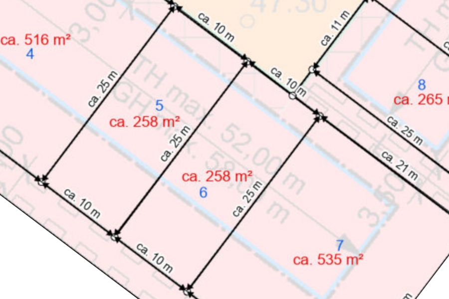 Auf einer Fläche von rund 11.915 m² sind bis zu 9 freie Baugrundstücke für den Bau von Doppelhäusern verfügbar.