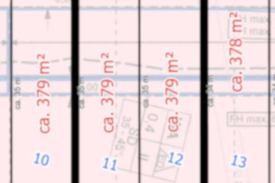 Es handelt sich um zwei nebeneinanderliegende, separat vermessene Grundstücke, die gemeinsam als eine Einheit verkauft werden. Beide Grundstücke müssen mit jeweils einer Doppelhaushälfte bebaut werden.