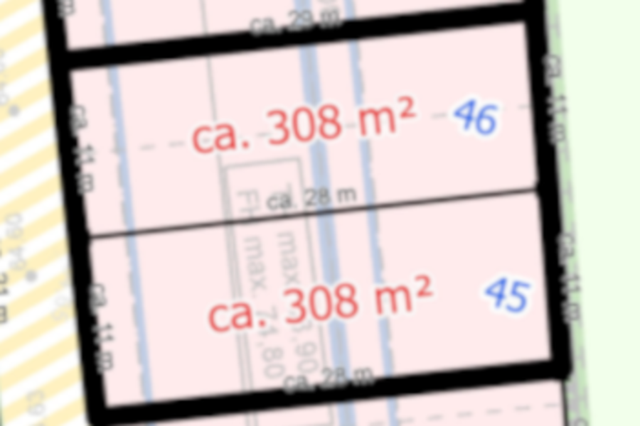 Es handelt sich um zwei nebeneinanderliegende, separat vermessene Grundstücke, die gemeinsam als eine Einheit verkauft werden. Beide Grundstücke müssen mit jeweils einer Doppelhaushälfte bebaut werden.