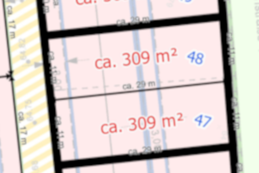 Es handelt sich um zwei nebeneinanderliegende, separat vermessene Grundstücke, die gemeinsam als eine Einheit verkauft werden. Beide Grundstücke müssen mit jeweils einer Doppelhaushälfte bebaut werden.