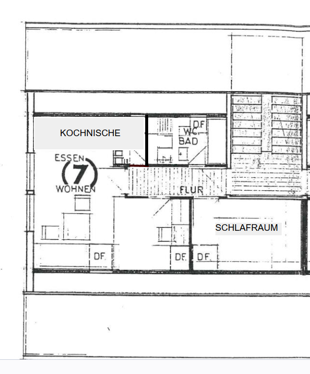 Ausstattung: Einbauküche in einer Kochnische / Bad mit WC / Flur / Kelleranteil mit ca. 9 m² / Pkw-Stellplatz vor dem Haus / Zentralheizung (Gas) / kein Aufzug vorhanden