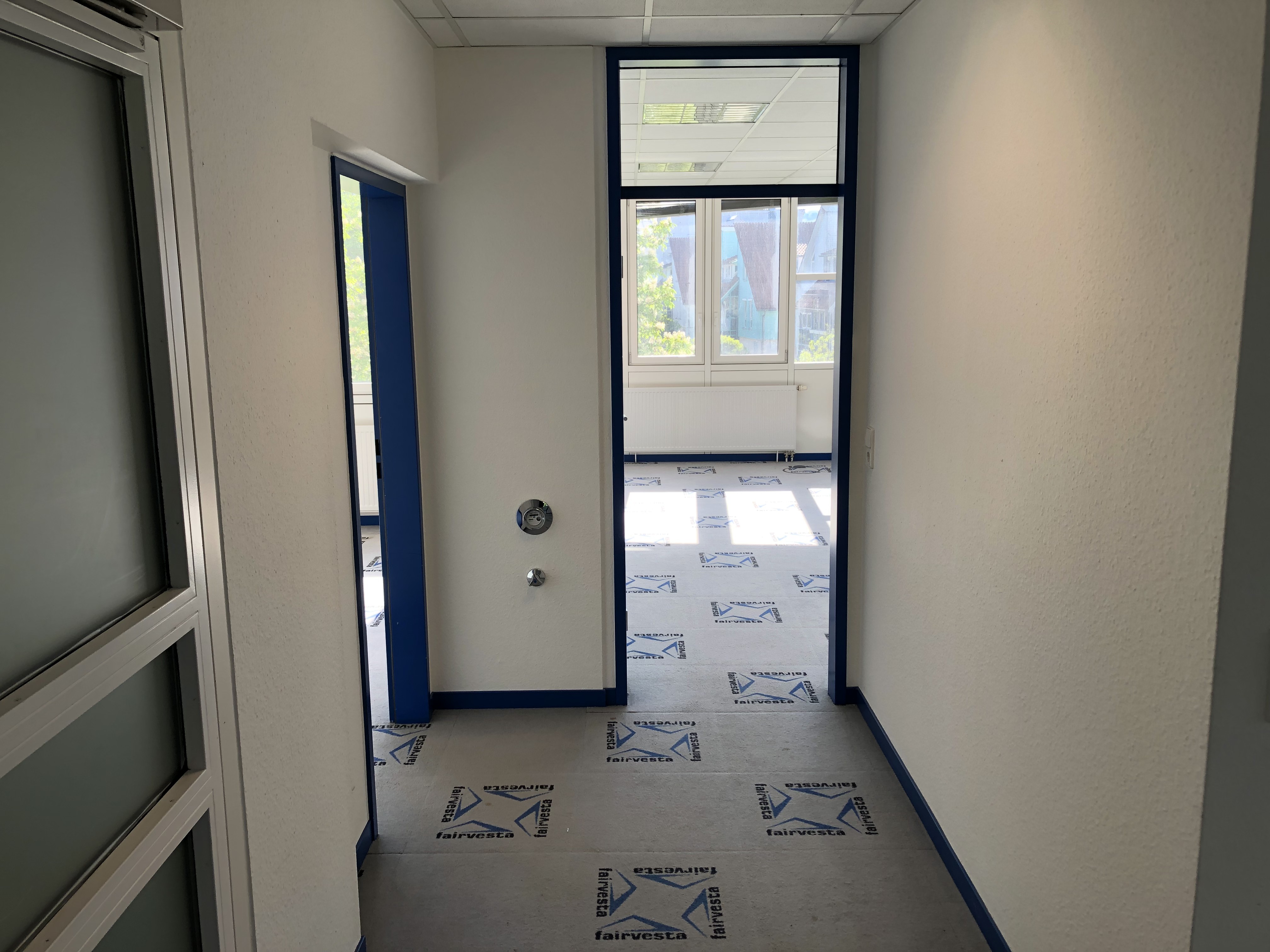 Die Bürofläche liegt im 2. Obergeschoss und ist komfortabel über einen Aufzug erreichbar. Auf insgesamt ca. 122 m² Mietfläche stehen drei großzügige Büroräume sowie ein einladender Empfangsbereich zur Verfügung. Der Empfang ist direkt an eine offene Küche angeschlossen und eignet sich ideal als Kommunikations- und Aufenthaltszone für Mitarbeiter und Besucher.