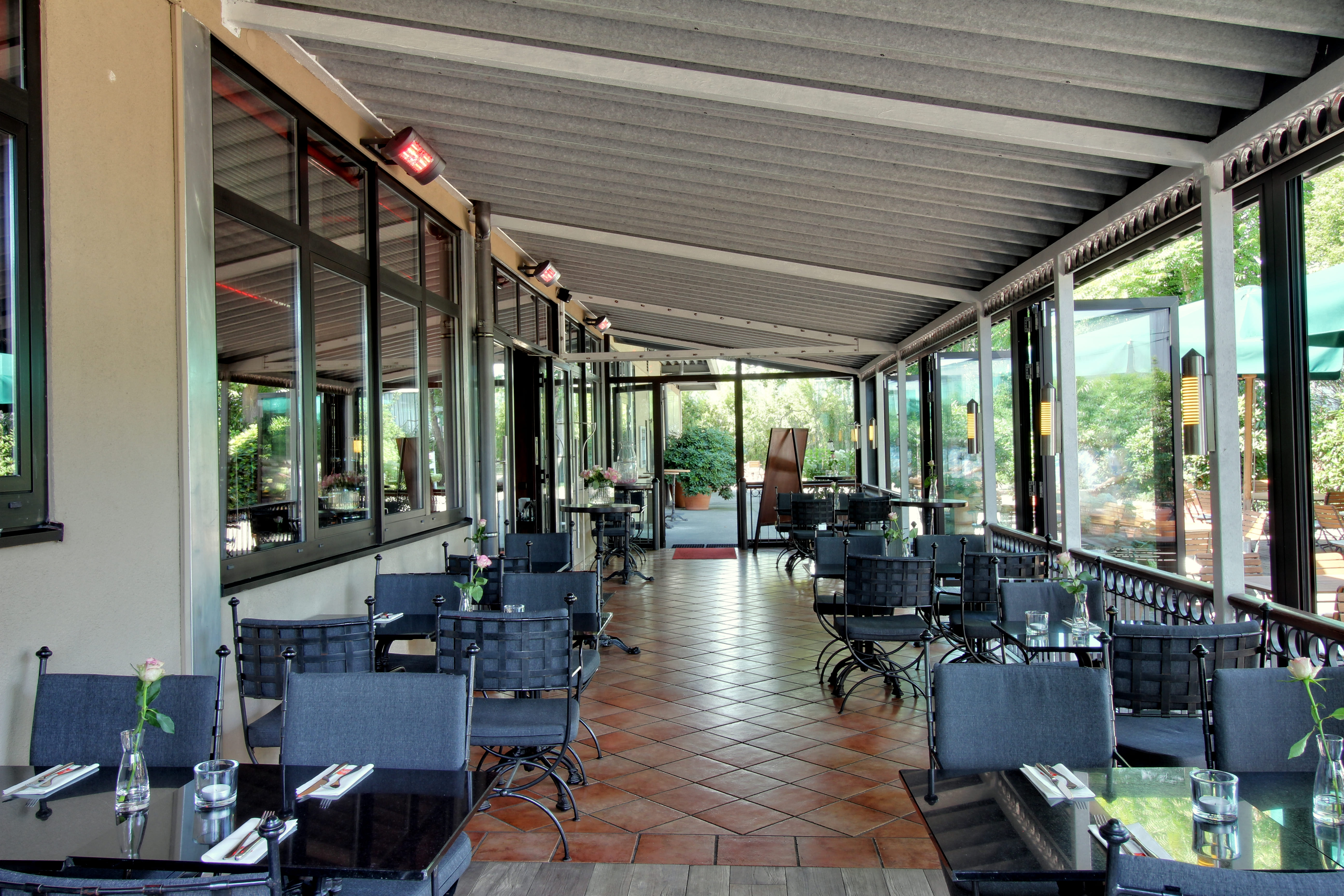 Die Fensterfront des Wintergartens lässt sich komplett öffnen und somit im Sommer dem Terrassenbereich und im Winter dem Restaurant zuordnen. Der Terrassenbereich ist ruhig gelegen und mediterran gestaltet.
