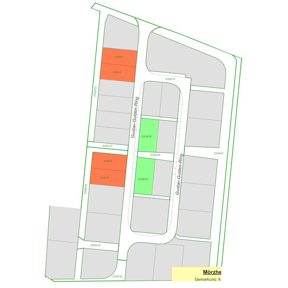 Hinweis zu FlStNr. 6359/2 und 6359/3 sowie FlStNr. 6359/8 und 6359/9: Der Stadtrat hat am 25. Februar 2025 das Zusammenlegen von jeweils zwei aneinandergrenzenden Grundstücken für Baugrundstücke für Einzelhäuser beschlossen. Zudem wurde in Abweichung zu der bestehenden Vergaberichtlinie vom 19. Juli 2022 beschlossen, dass auf den Baugrundstücken für Einzelhäuser zwingend 2 Wohnungen nach den Bestimmungen des §44 Landesbauordnung Rheinland-Pfalz (https://www.landesrecht.rlp.de... ) zu errichten sind, um die angestrebten Dichtewerte sicherzustellen. Hiervon ist jedoch nur eine Wohnung mit einer Eigennutzungsverpflichtung zu belegen.