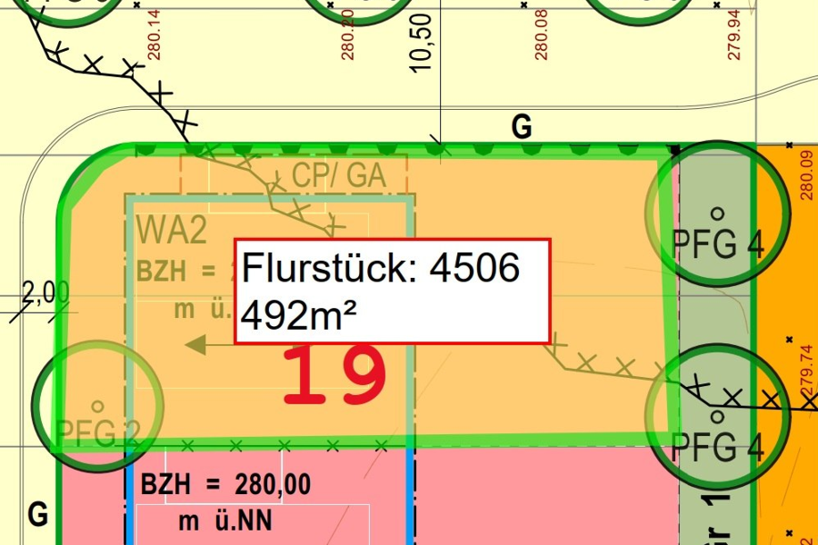 Der Bauplatz 19 (Flurstück 4506/0) befindet sich am Anfang der neu entstehenden Straße "Unter dem Gländ".