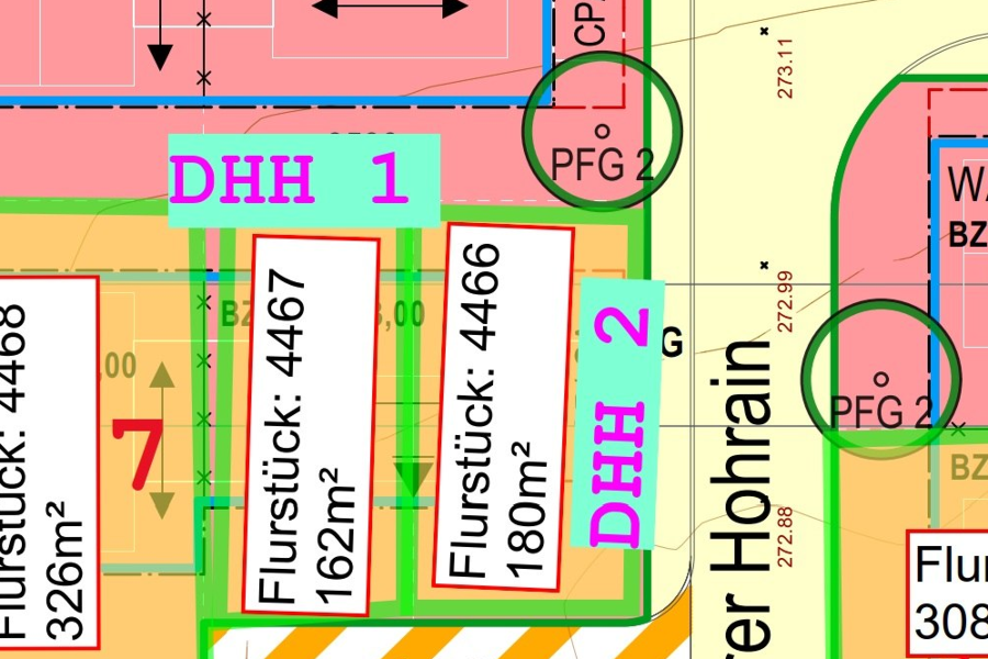 Der Bauplatz DHH 2 (Flurstück 4466/0) befindet sich in einem Seitenarm der Straße "Mittlerer Hohrain".