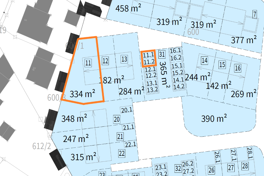 Die genannte Grundstücksgröße von 394 m² teilt sich in 334 m² Baugrundstück und 60 m² gemeinschaftliche Garagenhoffläche. Die Flächen können Sie dem Parzellenplan entnehmen, welcher Auszugsweise als Bild des Baugrundstückes hinterlegt ist.