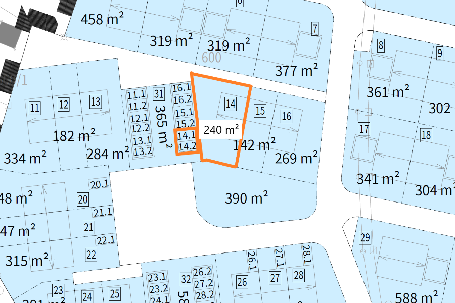 Die genannte Grundstücksgröße von 301 m² teilt sich in 240 m² Baugrundstück und 61 m² gemeinschaftliche Garagenhoffläche. Die Flächen können Sie dem Parzellenplan entnehmen, welcher Auszugsweise als Foto des Baugrundstückes hinterlegt ist.