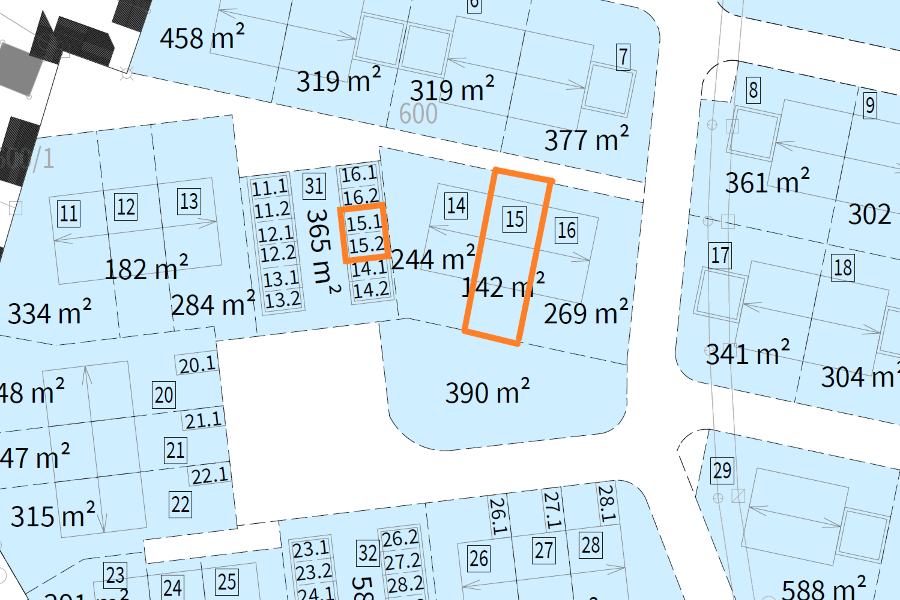 Die genannte Grundstücksgröße von 203 m² teilt sich in 142 m² Baugrundstück und 61 m² gemeinschaftliche Garagenhoffläche. Die Flächen können Sie dem Parzellenplan entnehmen, welcher Auszugsweise als Foto des Baugrundstückes hinterlegt ist.
