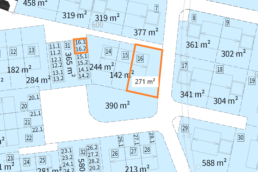 Die genannte Grundstücksgröße von 332 m² teilt sich in 271 m² Baugrundstück und 61 m² gemeinschaftliche Garagenhoffläche. Die Flächen können Sie dem Parzellenplan entnehmen, welcher Auszugsweise als Foto des Baugrundstückes hinterlegt ist.