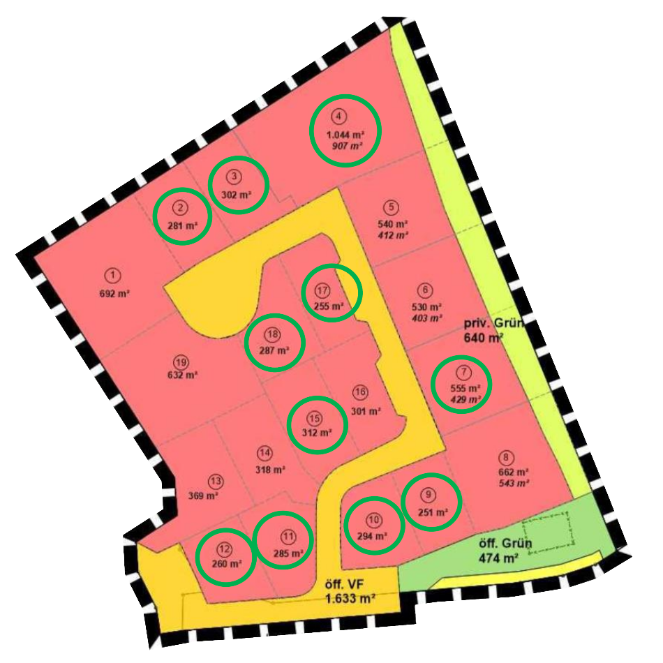 | Grundstücksgrößen: ab 249 m2 bis 1042 m2 | |