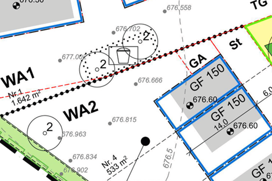 Die baulichen Angaben dienen grundsätzlich zur Orientierung. Die jeweiligen Festsetzungen der Einzelgrundstücke und die sich daraus ergebenden Berechnungen entnehmen Sie aus dem Bebauungsplan.