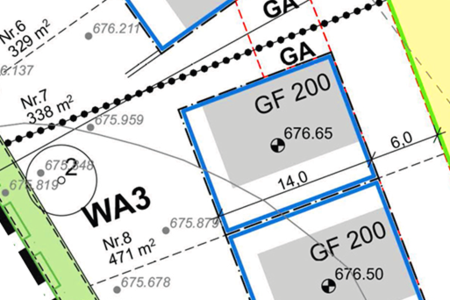 Die baulichen Angaben dienen grundsätzlich zur Orientierung. Die jeweiligen Festsetzungen der Einzelgrundstücke und die sich daraus ergebenden Berechnungen entnehmen Sie aus dem Bebauungsplan.