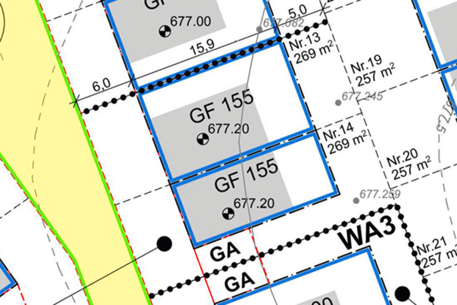 Die baulichen Angaben dienen grundsätzlich zur Orientierung. Die jeweiligen Festsetzungen der Einzelgrundstücke und die sich daraus ergebenden Berechnungen entnehmen Sie aus dem Bebauungsplan.