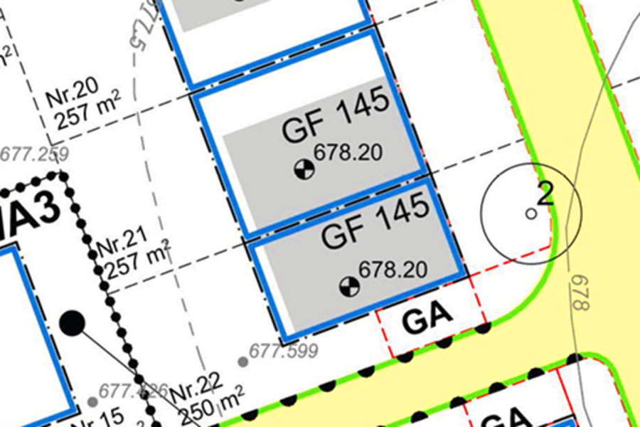 Die baulichen Angaben dienen grundsätzlich zur Orientierung. Die jeweiligen Festsetzungen der Einzelgrundstücke und die sich daraus ergebenden Berechnungen entnehmen Sie aus dem Bebauungsplan.