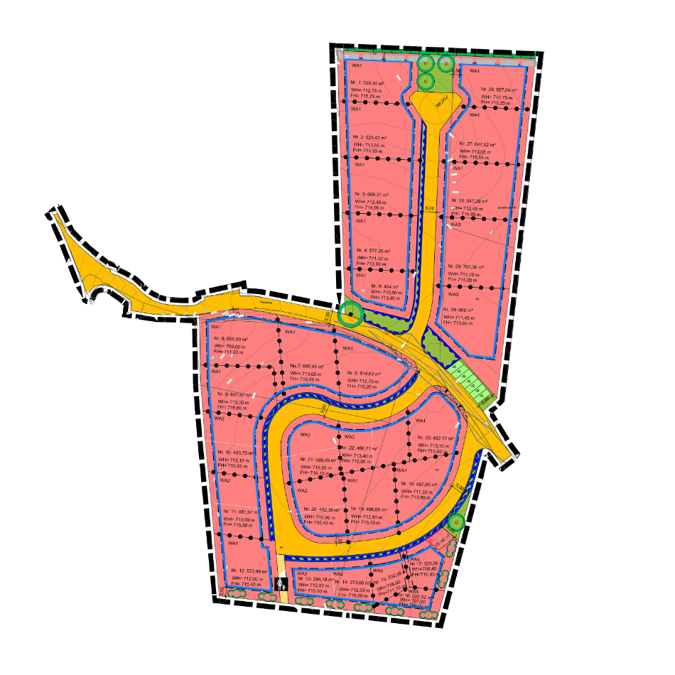 Das Gelände des Baugebiets ist sehr bewegt. Aufgrund des Geländes ist eine Besichtigung der Bauplätze dringend zu empfehlen.